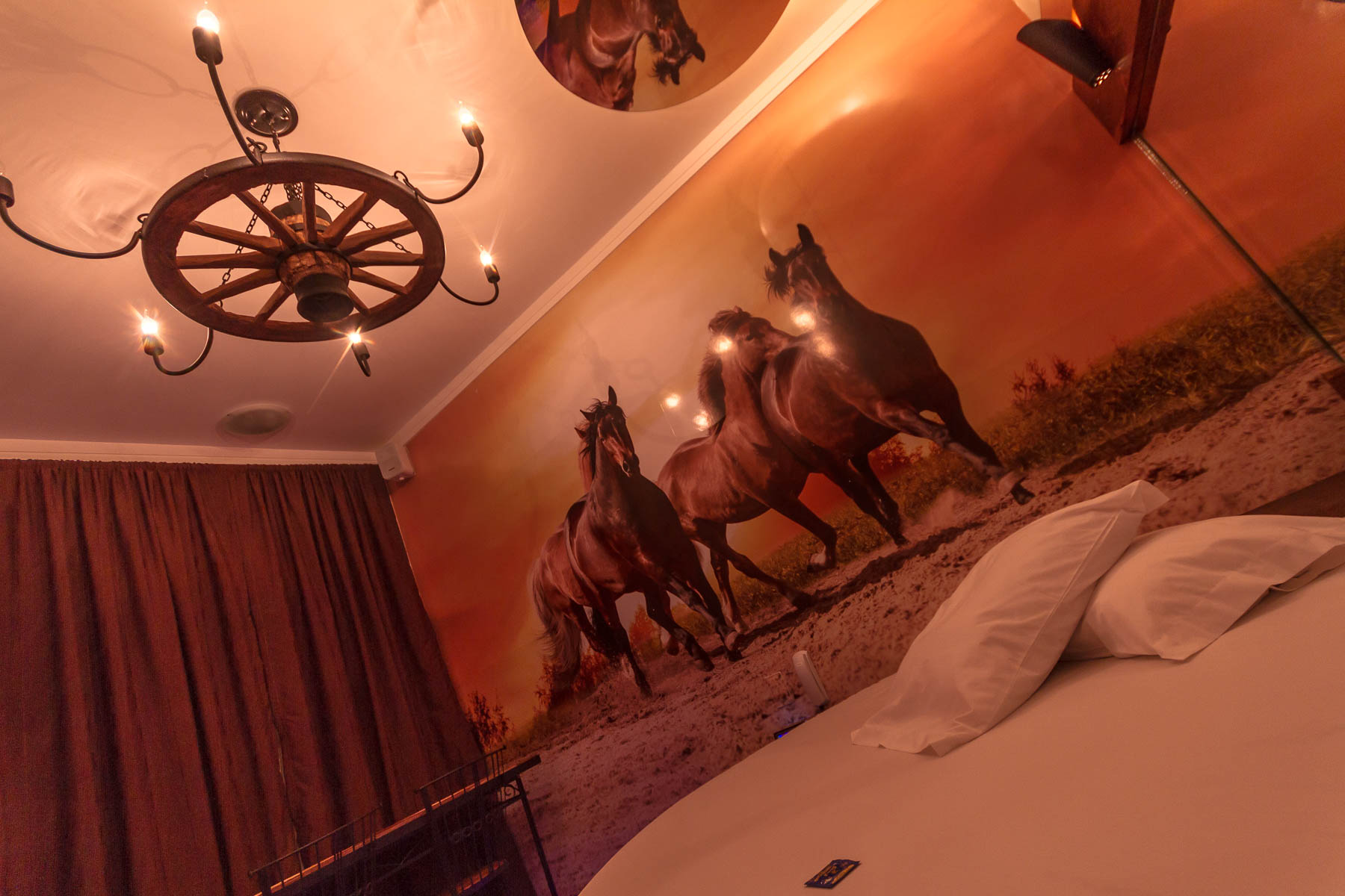 Cama redonda com decoração de cavalos selvagens e iluminação LED.